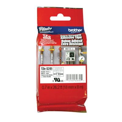 Brother P-Touch TZ-Series Strong Adhesive Label Tapes 18 mm.For use with Brother Label Makers, sold separately (product codes: PTD450, PTD600, PTH300 and PTH300LI). Provide up to twice the adhesive strength of standard laminated tapes.Ideal for uneven, rough and textured surfaces, as well as corners and curved areas.Laminated.Length: 8 m.Black type on white label.