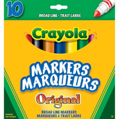 Crayola Broad Line Markers, Assorted Colours, 10/PK Tip size: broad .Package of 10. Great for writing or drawing so you can add bold, vibrant colour to artwork, school assignments and other creative projects .Deliver superb colour coverage and lay down with no bleed through or smudging on most paper.True-to-colour ink .Markers can be revived in warm water if cap is left off.Cap colour matches ink colour and is ventilated for safety.Non-washable.Non-toxic .Ink colours: assorted colours:.Barrel colours: white.AP Certified.