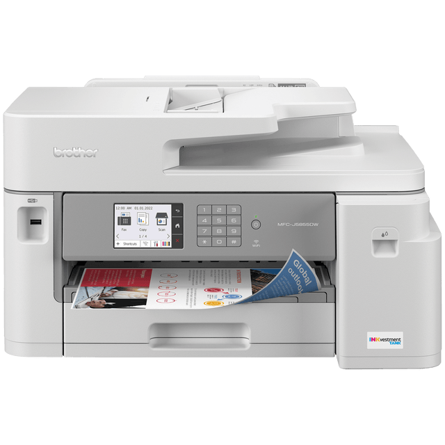 Go large and take charge! The Brother INKvestment Tank MFC-J5855DW all-in-one colour inkjet printer delivers durable and premium quality printing your business can rely on. With its larger format A3 printing capabilities up to 11Ó x 17Ó, this machine puts cost-effective, reliable, professional-quality output in your hands, fast. Enjoy flexible connectivity plus print and scan on the go with the Brother Mobile Connect App that lets you work wherever and whenever you want. Flexible paper handling like a 250-sheet paper capacity and a 50-sheet auto document feeder increase productivity by reducing paper refills, allowing you to concentrate on your work. Further improving efficiency, the print, copy, scan, and fax functions are easy to manage from a computer, mobile device, or using the intuitive 3.5Ó LCD colour touchscreen display. Plus, advanced triple-layer security helps safeguard sensitive documents while printing and our patented MAXIDRIVE print chip takes printing technology to the next level with speeds of up to 30 ppm. Built to perform and designed for exceptional ease of use right out of the box, this Brother printer delivers up to 1 year of uninterrupted printing thanks to INKvestment Tank technology and in-box ink.